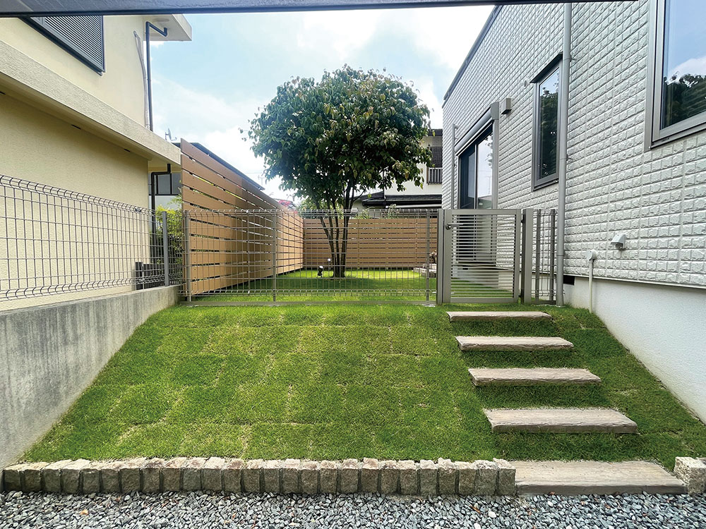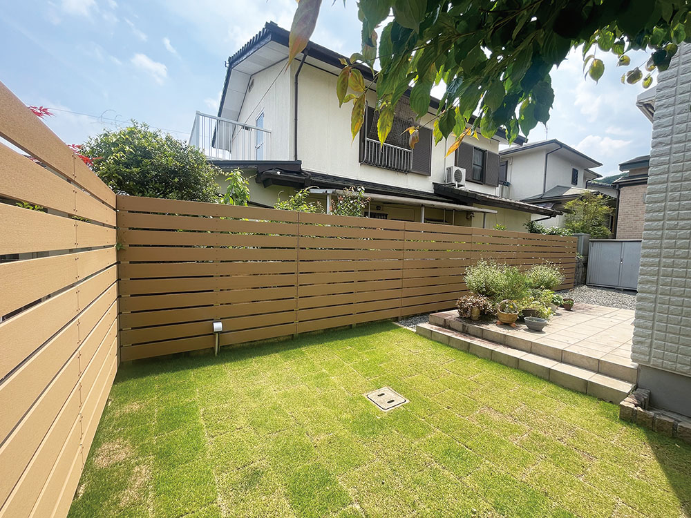天然の木材を使ったナチュラルテイストのお庭だったのですが、天然木は塗装などのメンテナンスをしていても、10年から15年で寿命が来てしまいます。今回はそのフェンスのリフォームと、ワンちゃんのために天然芝の張り替えをさせていただきました。