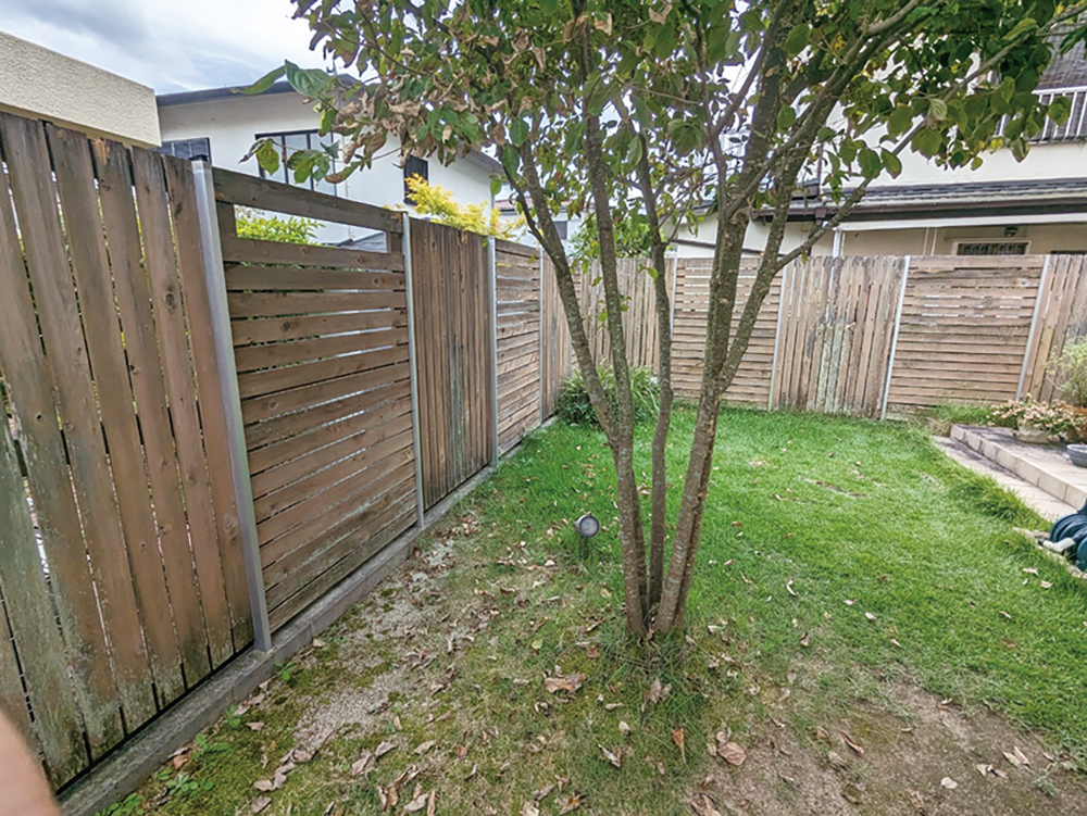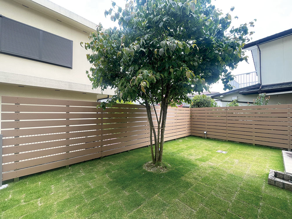 朽ちてしまった木製のフェンスはメンテナンスフリーの人工木板塀エコモックオリジナル145を使用し、すき間を25ミリの10段にやり替えました。