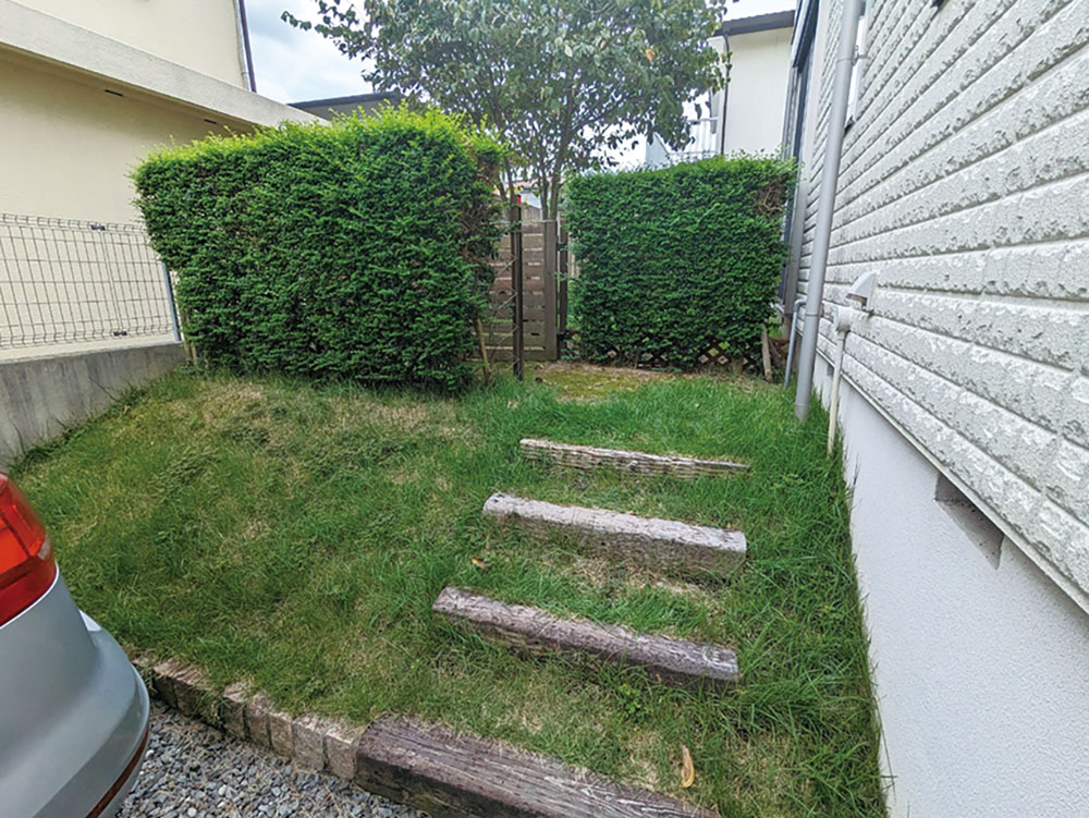 また法面の木製階段を、コンクリート製疑木平板にてメンテナンスフリーの階段にやり替えました。手間のかからないすっきりした綺麗なお庭にリフォームさせていただきました。